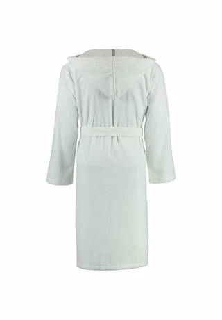 Dieser Bademantel schließt mit einem Bindegürtel in der Taille und hat eine Kapuze und Taschen.